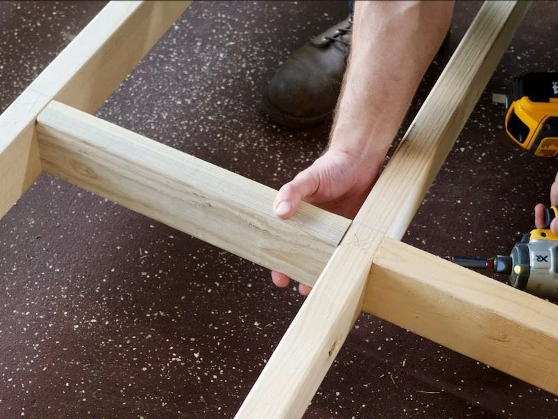 To transfer our measurements from the bottom plate to the top plate, we again called on the line laser. I would line up the laser with one end of the lines and Justin would transfer that mark to the top plate, using a square to bring the line across. This meant I didn’t have to try and perfectly align the laser with the entire line, just one end of it.