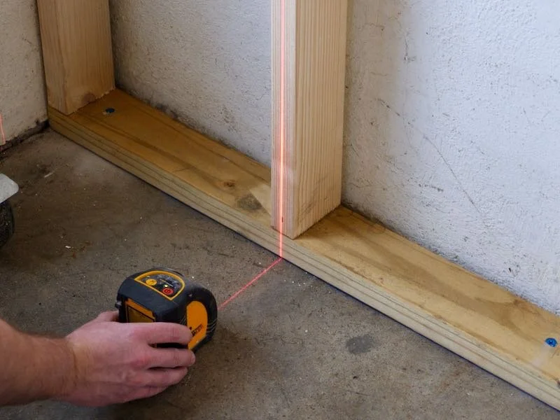 First, we would set up a line laser roughly four inches off of the wall. The extra half inch of clearance between the concrete wall and 2x4 wall would allow us to work around any inconsistencies in the concrete wall, which there were a ton of, and we could still maintain plumb in our new walls.