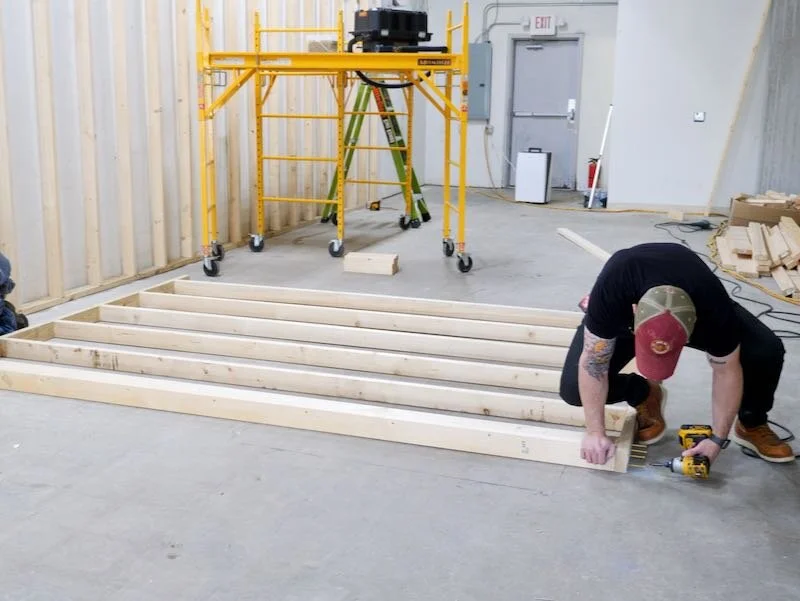 The next day, we got to work framing and the process went pretty quickly, although this was my first time ever framing, so I had a lot to learn. Also, we used 3” screws rather than nails for this build, in case I ever need to remove any of this material if I have to leave the space in the future, so that slowed things down as well.