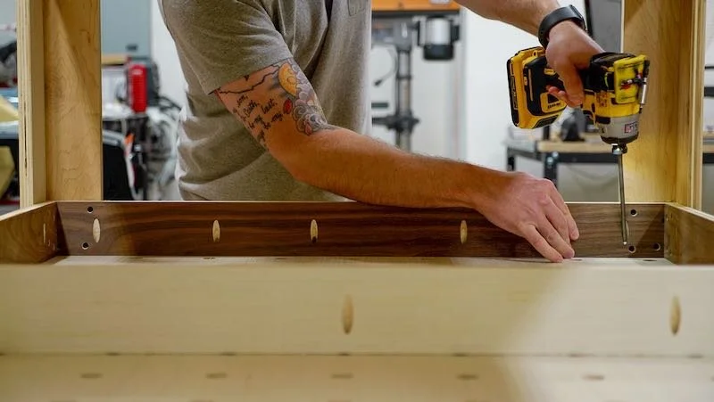 After assembling the sides, I could get the base finished by attaching the long stretchers to the sides. Once again, I used glue, brad nails, and screws, and also made sure everything was square with a large speed square.