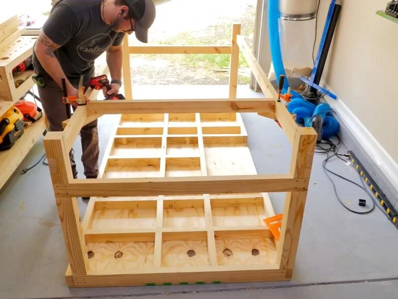 With the bottom framing in, I could finally flip the workbench over and, let me tell you, this thing is solid. It already weighed quite a bit at this point, and I still had a ton more stuff to add to the bench.