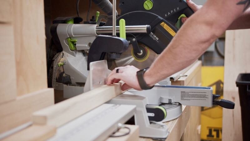 Once the piece was nice and flat, I trimmed it to final length at the miter saw, making sure to cut the end with the angled piece to the correct length, so that the angle would line up with the baseboard.
