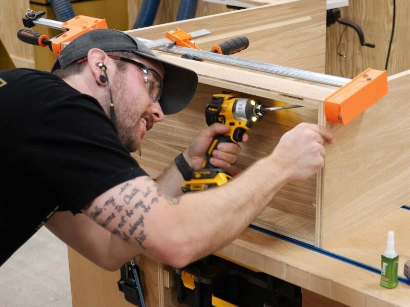 After adding the glue, I clamped the pieces in place then drove in the pocket screws. I was really careful about making sure everything was properly aligned before driving in the screws, as any misalignment here will cause lots of issues later on.