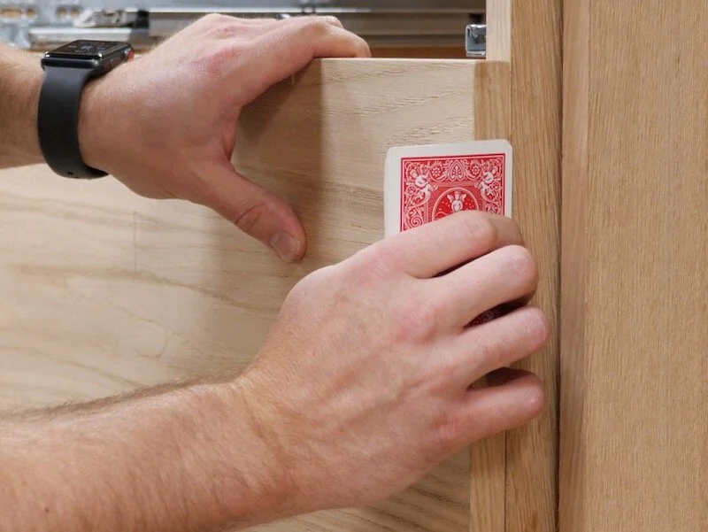 I started with the bank of cabinets, mounting the bottommost drawer front first. I used some playing cards to space the drawer front off the bottom of the cabinet about 1/16”, clamped the drawer front in place, then pre-drilled a few holes and drove in some 1” screws from inside the drawer box.