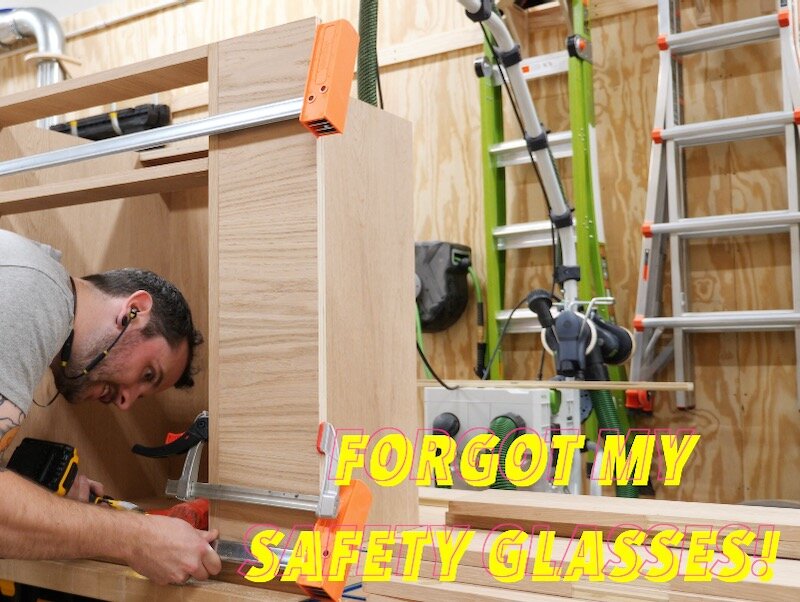 Anyway, with all of the pocket holes drilled correctly, I could move on to assembling the upper cabinets. Again, I used Krazy Glue and pocket screws, and this time I decided to clamp both sides in place and drive in the screws. This worked well, and I could also use this parallel clamp to align each area of the panels before driving in the screws. The plywood was slightly warped on the side panels since I got caught in a rain storm coming home from picking it up, so I really needed to use the clamps to help keep things aligned.