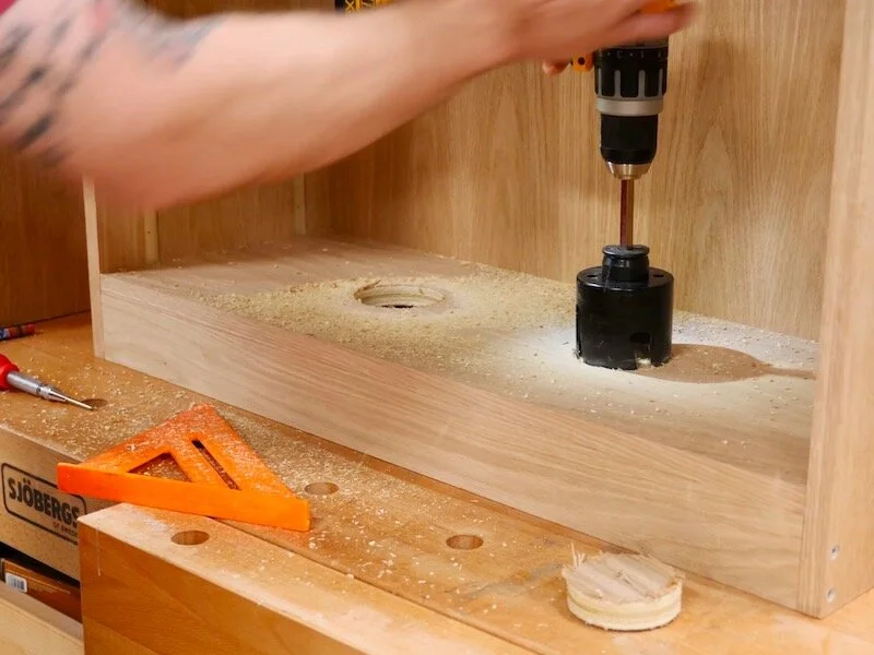 Next, I needed to drill the holes for the recessed lighting in the top of the upper cabinets. I needed to drill 3” holes for these lights and I drilled the holes with a hole saw. I picked up a new hole saw for this and it has a super cool feature of ejecting the cutoff without needing to pry it out.