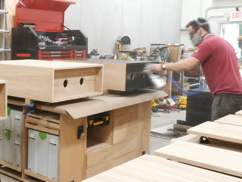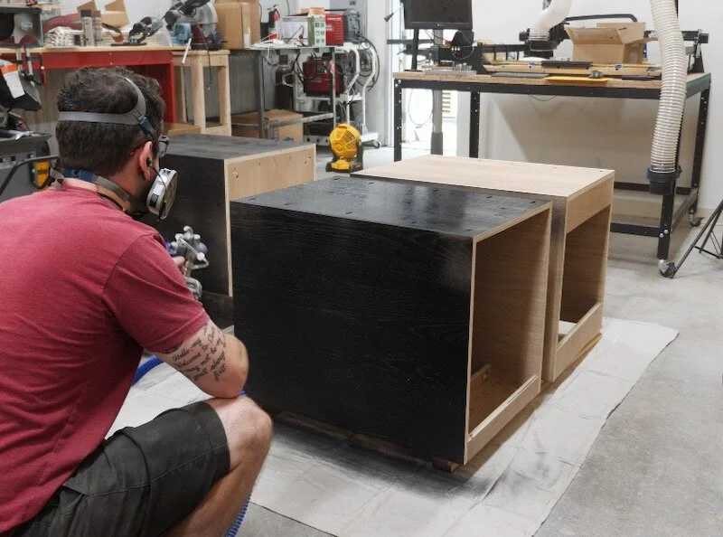 Once all of the sanding was done, I got all of the pieces set up for finishing and then got to spraying. I’m using General Finishes Enduro Black Poly here and I must say, it sprays like a dream. You can roll it on, but since I had a ridiculous amount of surface area to finish, I went with the spray option.
