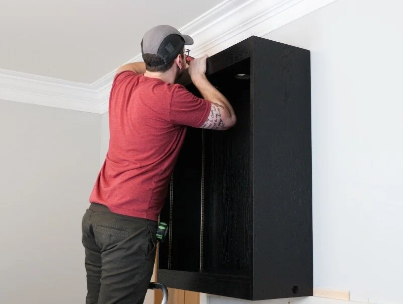 Speaking of the studs, next I measured where my stud locations were on the wall, transferred those marks to the backs of the cabinets, and pre-drilled holes in the cabinets at these locations. These cabinets absolutely have to be mounted to studs, as they will be holding a ton of weight. I added screw holes at the top of each cabinet to start and partially drove screws into the holes.