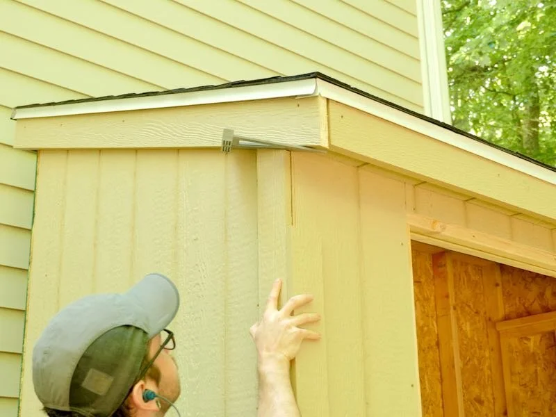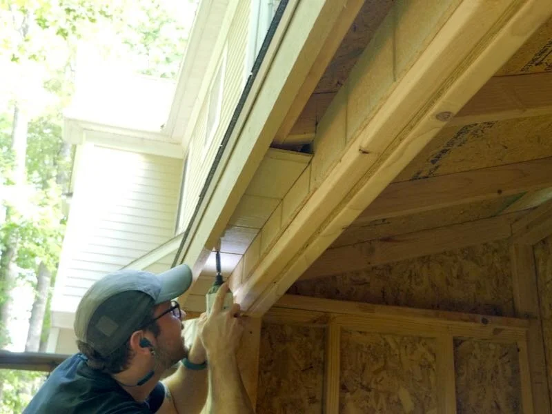 Now that the shed was dried in, I could move back to the trim, and the next pieces to install prior to the corner trim were a few pieces to cover the soffits on the underside of the rafters.