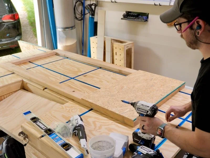 To assemble the doors, I first attached these OSB pieces to the 2x4 framework that makes up the core of the door using some 1 ⅝” trim head screws. I made sure to check for square frequently here, as the last thing I wanted was an out-of-square door that wouldn’t fit in my door opening, but, after locking in the squareness, I came back and added a bunch more screws for reinforcement.