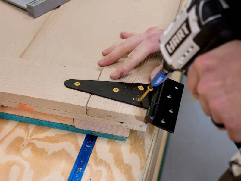 With the spacing dialed in, I could attach the other side of the hinges to the shed using more 3” screws. These screws go into the door opening framing and create an extremely strong door that should resist sagging over time.