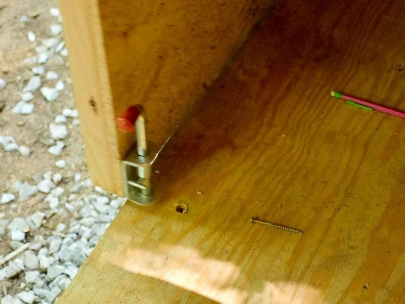 To hold the right door in place, I added a latch where I can add a padlock to secure the door. I centered the latch on the doors and also made sure to use 2 ½” screws rather than the included screws, so the latch was securely attached to the door framing.