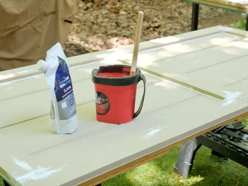Once the caulking was done, I could move on to paint, first painting the trim white. I used TotalBoat Elixir paint on this shed, and you might have seen me use this paint on previous projects. Elixir is a water-based enamel paint and is super durable, dries quickly, and has almost no fumes.