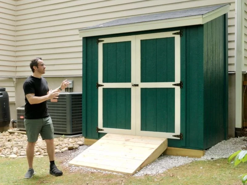 The last major part of this shed build was adding a ramp, so we can roll items in and out of the shed easily. I had mocked up a ramp in SketchUp, but honestly, it’s probably best to just cut your pieces on site, as you’ll see.