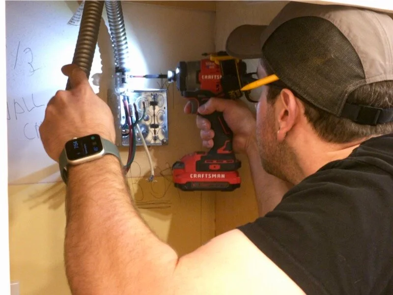 After verifying everything was wired correctly, I could cut out the opening for the outlet in the back of the cabinet using a hole saw and a jigsaw, and then I could get the cabinet installed.