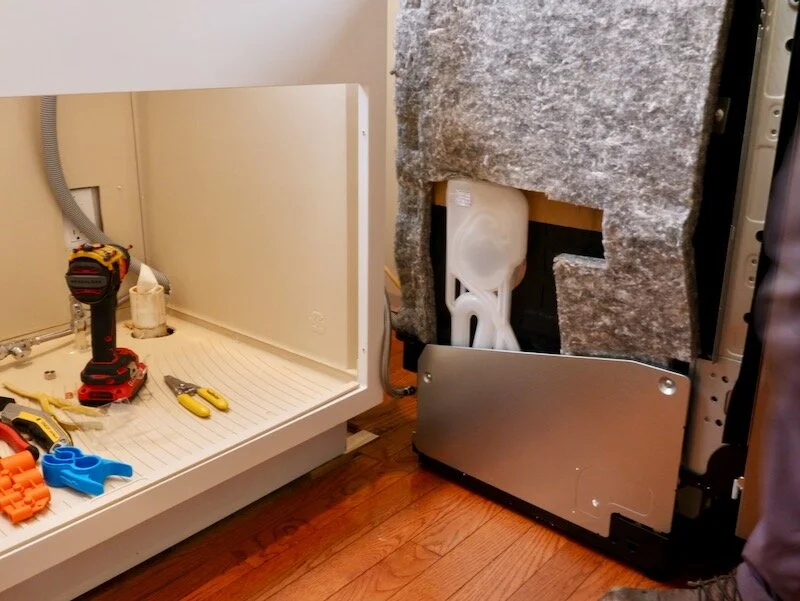To install the dishwasher, I first drilled a hole through the side of the cabinet for the dishwasher supply line, as well as the drain line. I attached one end of the supply line to the hot water supply and then attached the other end to the back of the dishwasher. I turned on the water to check for leaks, which I did have, so I tightened the nut on the back of the dishwasher and then checked it again, and I was leak free.