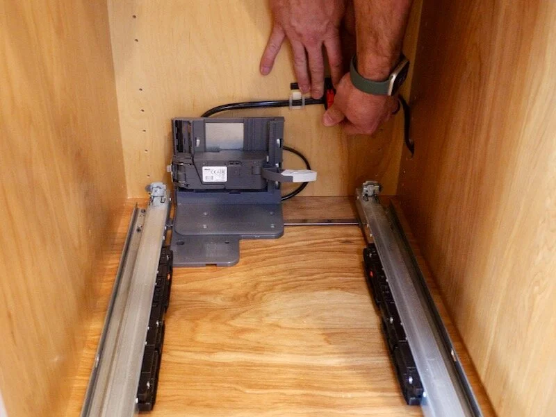 Finally, I used the cable clips provided to route the cord along the back of the cabinet, to keep it from interfering with the drawer, and, after a little adjustment, I got it working really nicely.
