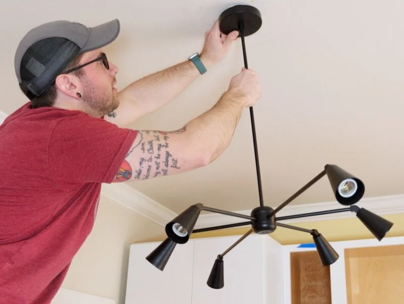 The last bit of electrical work was a new light fixture above the island, which I should have installed before installing the island. This fixture is made by Illuminate Vintage and I picked it up from the Lowe’s website. I absolutely love the look and it puts off way more light than our previous fixture, plus they’re made by hand in Texas. It even came with these LED light bulbs, which was a nice touch.