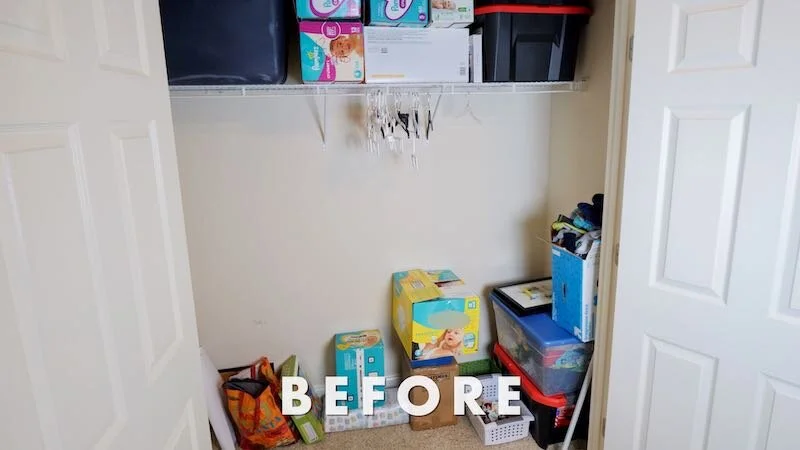 With our second kid arriving soon, now felt like the time to finally give these two closets a complete makeover. My plan was to fill these closets out with a base cabinet with drawers, an upper cabinet with adjustable shelves, and then four more shelves with closet rods for hanging clothes.