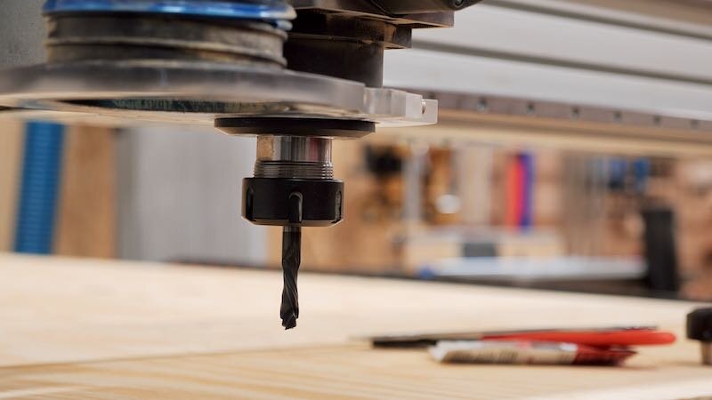Thankfully, after flipping the sheet over, my vacuum pump was able to pull the sheet flat to the spoil board and I could get my first bit, a 5mm drilling bit which drilled the drawer slide mounting holes and the adjustable shelf pin holes, zeroed out. After zeroing the bit, I ran the first program, which took all of 30 seconds.