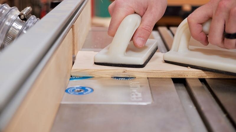 These clips friction fit into a groove on the back side of the toe kick pieces, and next I needed to cut that groove at the table saw. I really tried to sneak up on the fit but unfortunately still ended up with a looser fit than I wanted, but that was easy enough to fix with a little CA glue when it came time to add the toe kick.