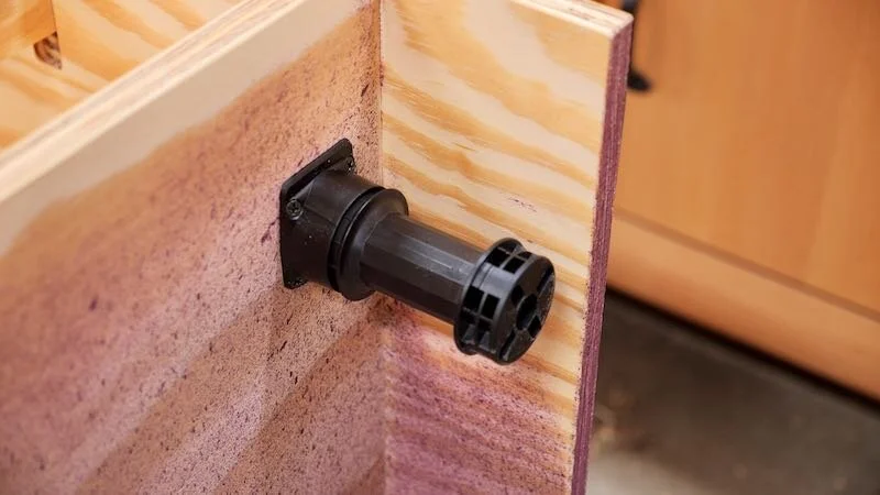 Once the clear coat had dried, I could move on to getting all of the hardware added to the cabinets, starting with these leveling feet from Rockler. The CNC had actually already cut the holes for these in the bottom of the base cabinets, but I needed to enlarge the holes to work with these particular feet.