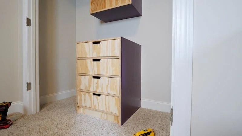 Speaking of which, next I could get to painting and I ended up going pretty funky on this project and went with this pretty cool shade of purple for the outside faces of the cabinets. I think this purple really played off the yellow of the Pine plywood nicely, plus these cabinets are for kid’s room closets.