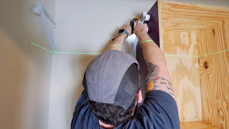 To install the brackets, I first set up my line laser at the height of the bottommost mounting location on the brackets and then screwed the left bracket onto the wall, hitting the corner stud. Unfortunately, the right bracket didn’t have a stud anywhere near where I wanted to mount it, so I instead went with toggle bolts here.