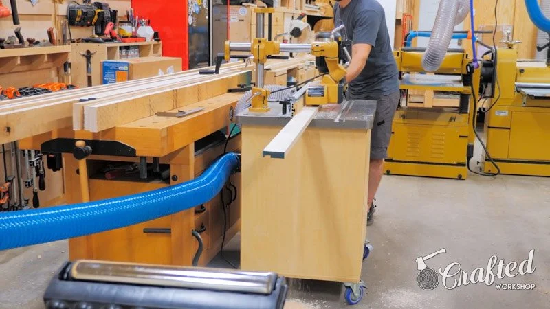 After getting the bit height and fence position set, I moved my power feeder into place, and this tool really made this whole thing possible, as I can’t imagine trying to manually feed 12 foot long pieces of trim through a router table unless you had a second set of hands.