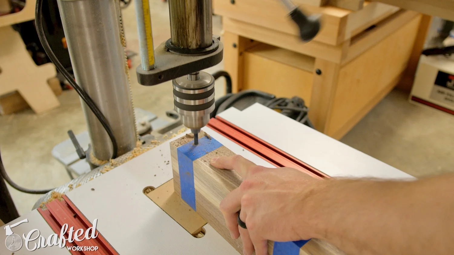 I drilled this hole on the drill press to make sure it was straight, but a handheld drill would get the job done.