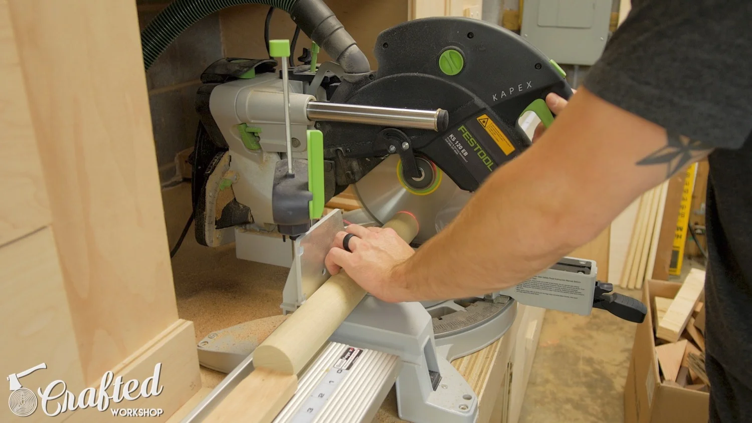 Next, I cut my dowels to length at the miter saw. This is a 2” dowel that I picked up from my local home center. The dowels needed to be cut to fit between the legs.