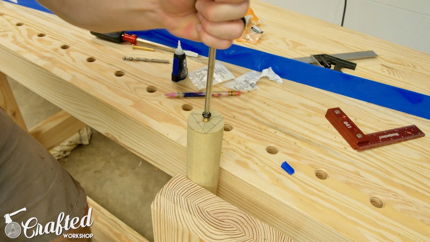 Next, I needed to drill holes in the center of the dowels for the threaded inserts I’ll be using to attach the dowels to the legs. I learned this trick to find the center of a circle. Draw a few straight lines around the edges of the circle (these are called chords). Measure and mark the center of each of the lines, then use a square and draw a line square to the line. Where these lines intersect is the center of the circle.