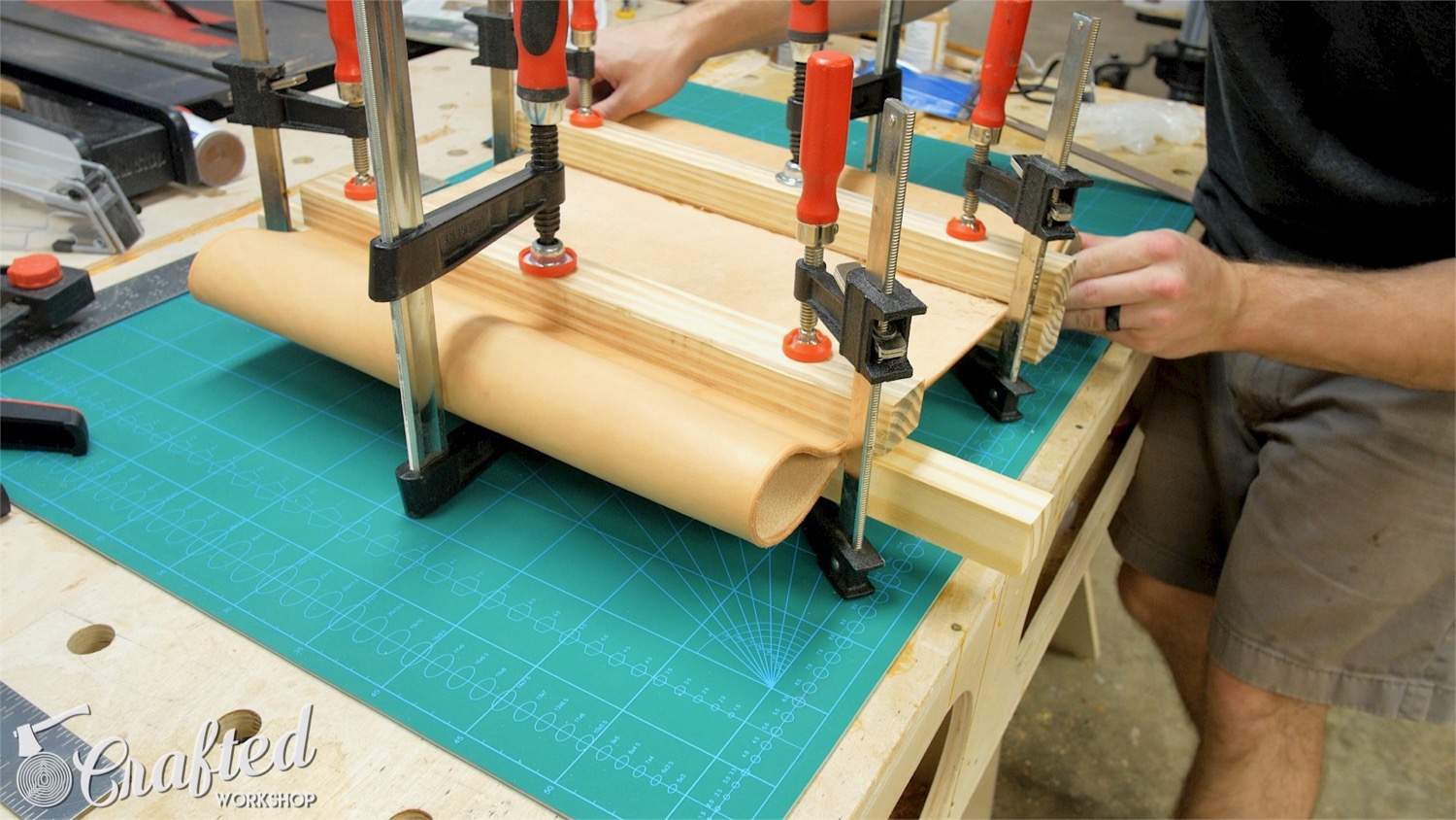 I applied the barge cement, adding a thin layer across the entire surface of the areas I had laid out, let it dry for 20 minutes, then clamped it up. Make sure not to clamp your leather too hard, as you will accidentally emboss the surface otherwise.